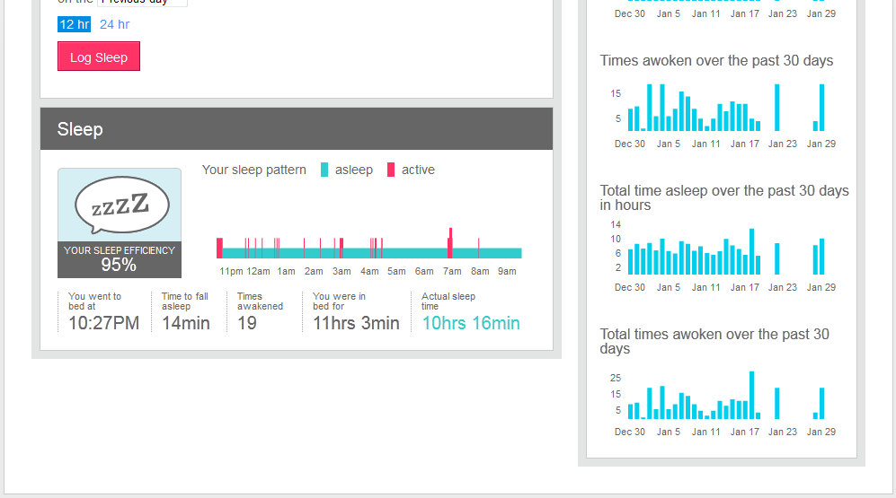 You can see that last night I had a 95% efficient sleep, but I was “awakened” 19 times. I think this is mostly when I roll over or move. Basically I got a ton of sleep last night, and it was much needed! I highly recommend this fantastic device to anyone looking to increase their health and pay more attention to the activity they get throughout a day.