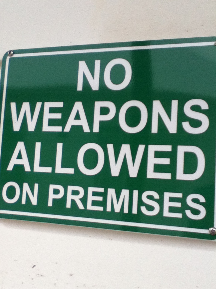 {My most interesting sign picture of the week. This is posted on my work building. Don’t bring weapons to therapy, mmmkay?}