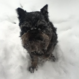 {We got an actual snow storm. Of like 12 inches of snow. Our first “real” snowstorm since Halloween. Skeeter is not impressed. He is looking forward to North Carolina!}