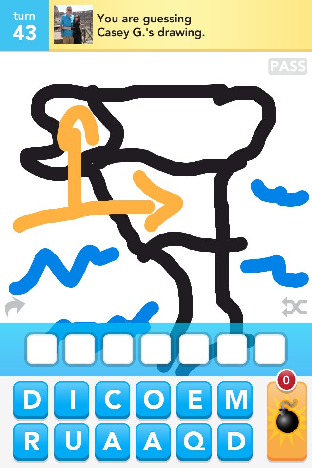 Draw Something feature of the week again comes via Casey! What are your guesses? When I asked around I got, sink drain, fallopian tubes, and the map of a cow’s leg. Guess what it really was? AMERICA. Apparently the arrows are pointing to Alaska and the Continental United States. Right. Totally got that.