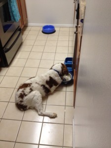 {Last week was a hot week! The locals say it isn’t usually this hot. We have nothing to compare it to, so we just enjoyed ourselves at the pool and the beach. But Barney? He was so hot he couldn’t even stand up long enough to eat. All in all, laying down with your face in a food dish doesn’t sound all that bad to me either.}