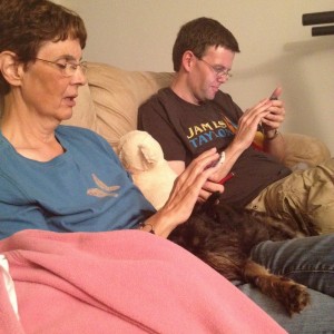 {Mom came to visit, and we were so busy having fun that this is literally the only picture I took. Two buddies playing games on their iPods – probably with each other. But we also signed papers for our new house which will break ground on in August!}